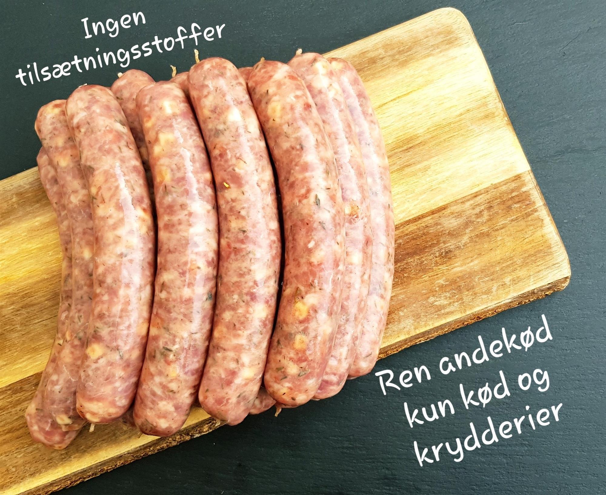 En rå pølse lavet på andekød fra udbenede andelår med skind for en saftig pølse