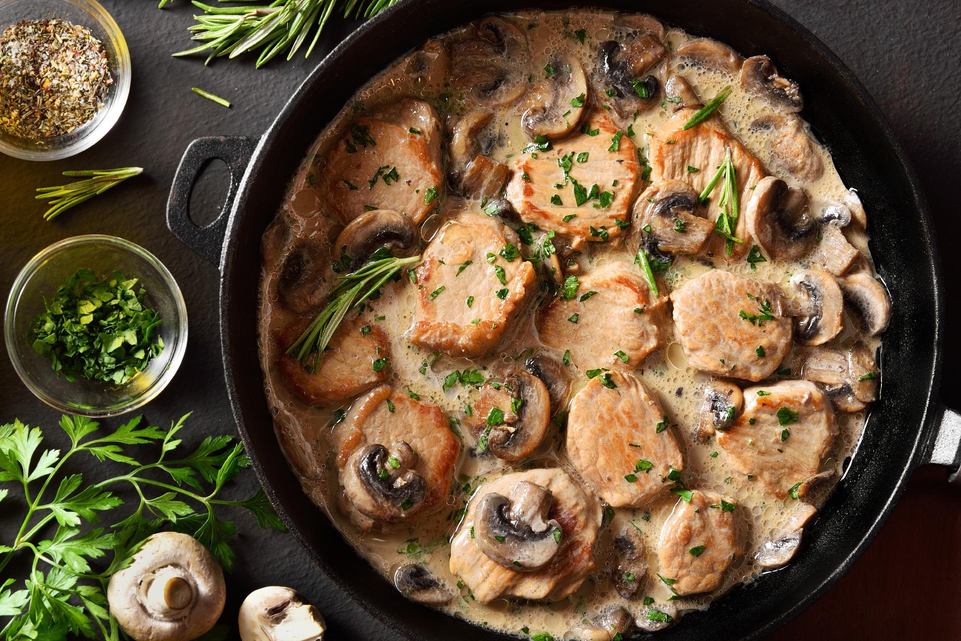 • Mørbradbøf af frilandsgris med ristede svampe og bløde løg.